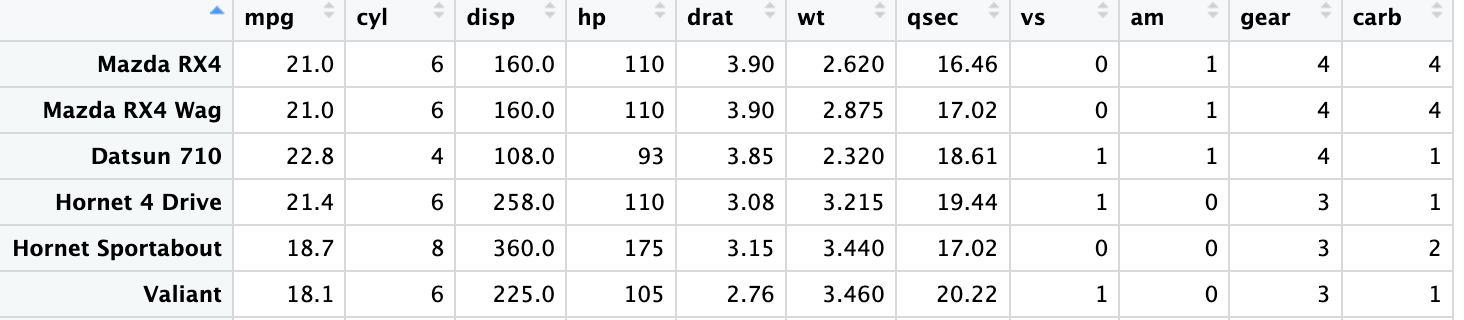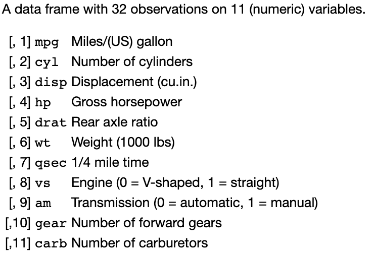 mtcarsThe mtcars data file provides information on various features of different brands of cars, including their engine size, horsepower, and fuel efficiency. The dataset is structured as a table, where each row represents a different car, and each column represents a different variable or feature of the cars.
