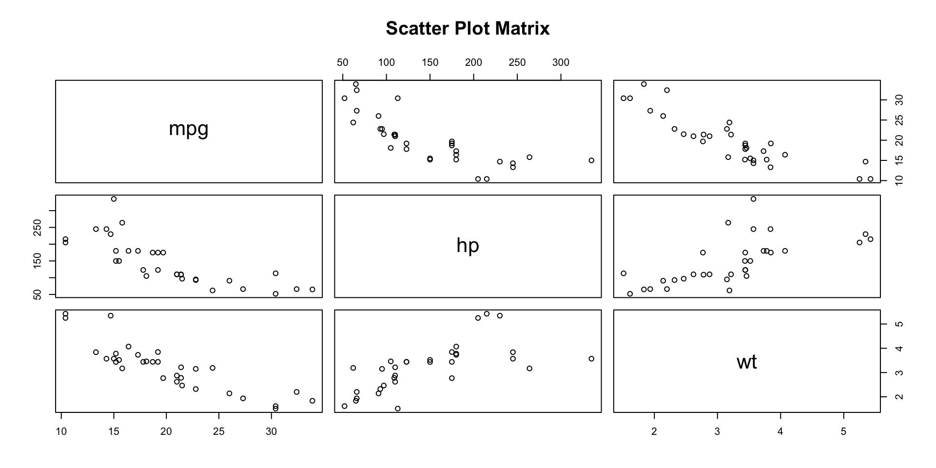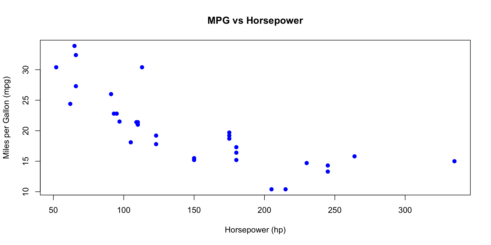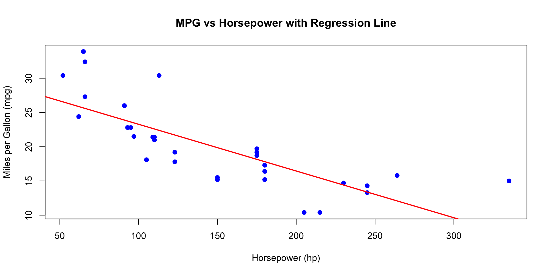 mpg when hp is zero.mpg for each additional horsepower.R-squared: Proportion of variance in mpg explained by hp.