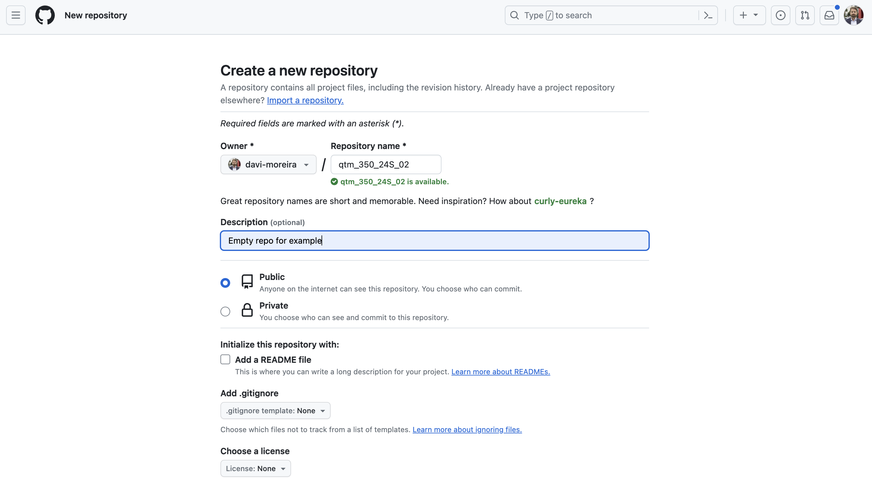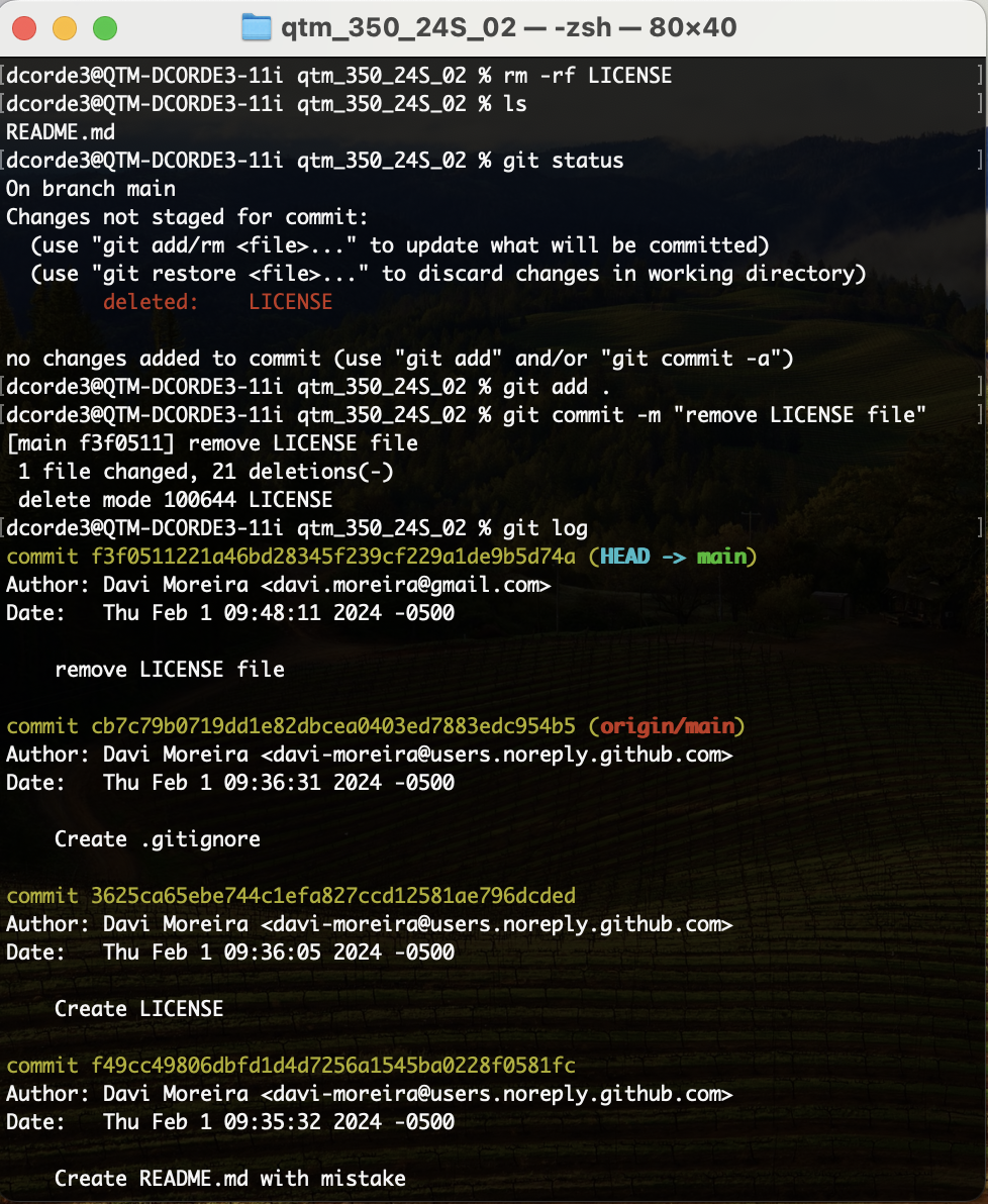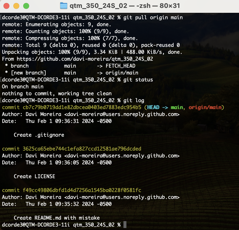 README.md file in the remote repo and commit:README.md file in the remote repo and commit:LICENSE and .gitignore files in the remote repo and commit:LICENSE.md file locally and commit.Push request. Conditioned on your settings, it will requires your user name and password.repo on GitHub.README.md file.git pull