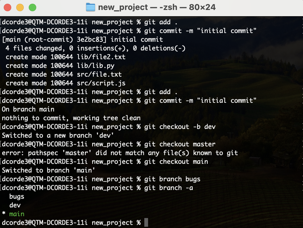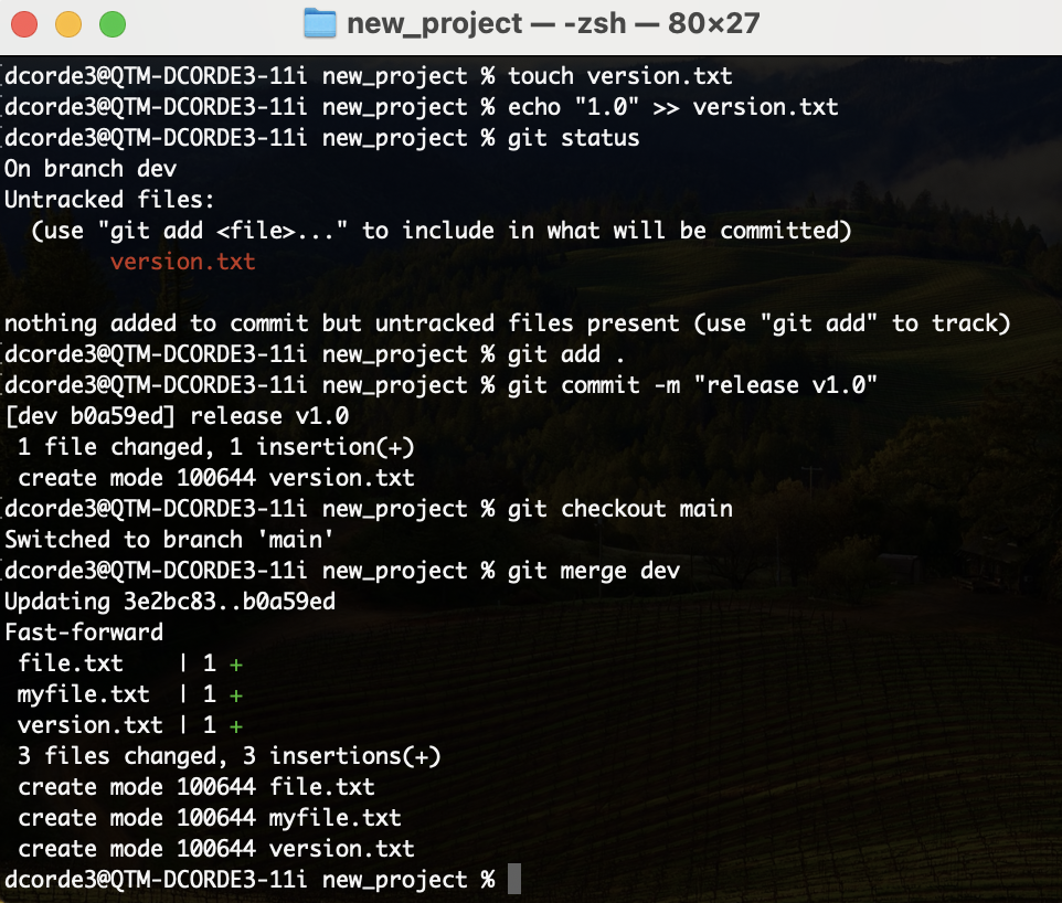 dev, and switch to the new branch.main branch, create a new one bugs, and list themdev branch.version.txt filedev branch and do a new commit and keep working in the dev branch.git checkout dev