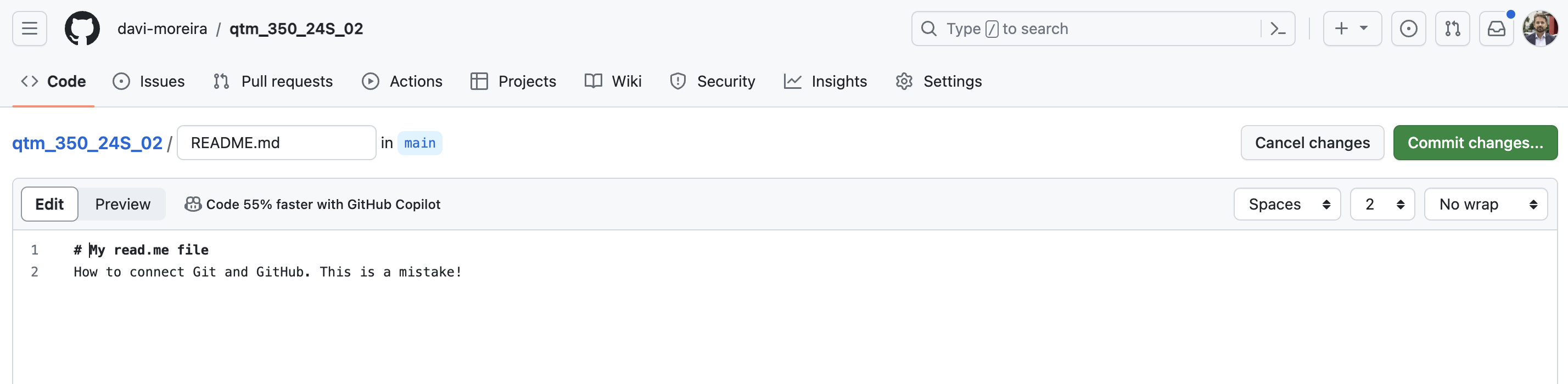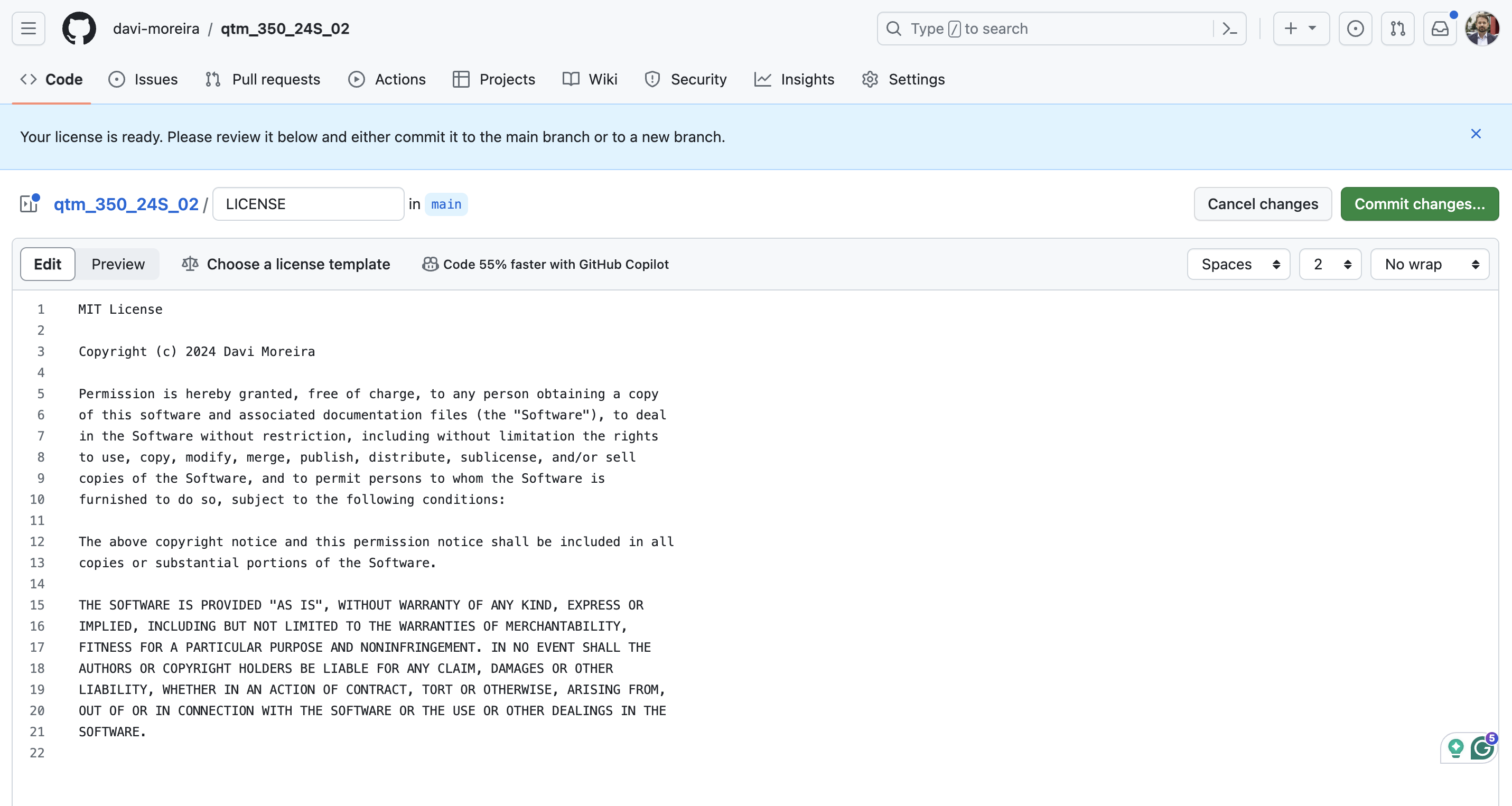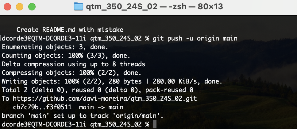 README.md file in the remote repo and commit:README.md file in the remote repo and commit:LICENSE and .gitignore files in the remote repo and commit:LICENSE.md file locally and commit.Push request. Conditioned on your settings, it will requires your user name and password.repo on GitHub.README.md file.git pull