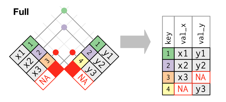 planes by: tailnum.airlines by: carrier.airports by: origin and dest.weather by: origin, year, month, day, hour.full_join()inner_join()right_join()left_join()For instance, to attach airline names to flights: