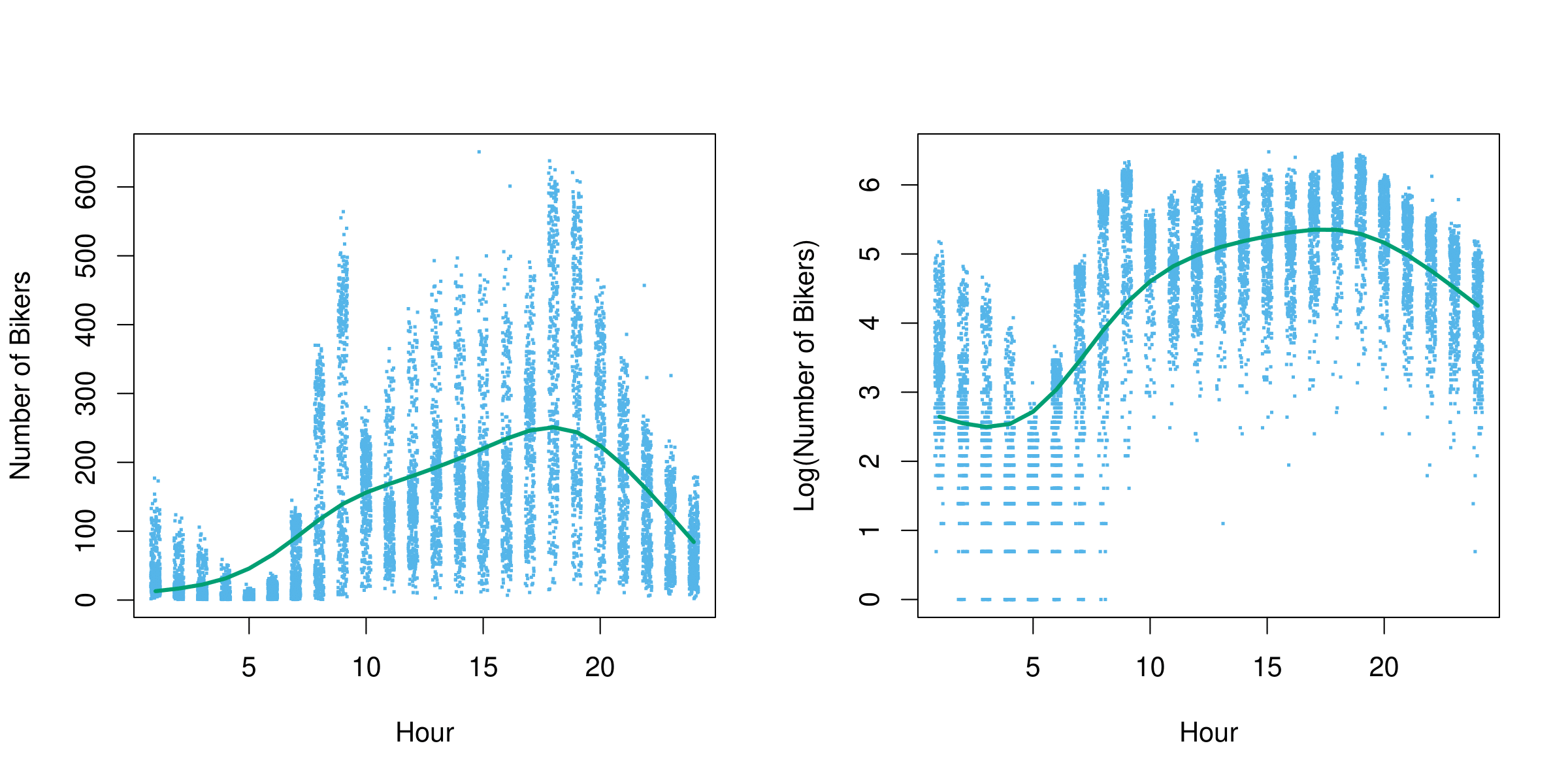 bikers, is always positive.log(bikers) alleviates this, but is not a good solution. It has its own problems: e.g. predictions are on the wrong scale, and some counts are zero!Poisson distribution is useful for modeling counts: