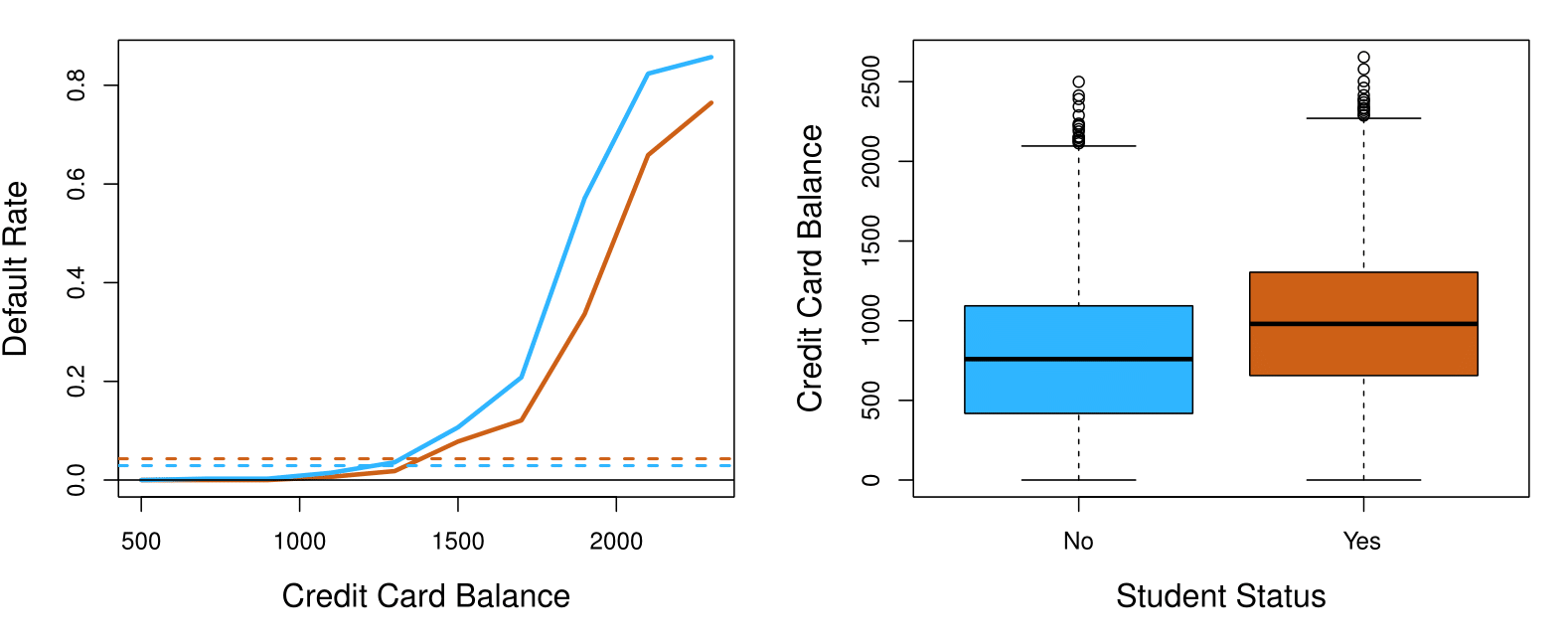 Boxplots comparing balance and income for default (“Yes”) vs. no default (“No”).