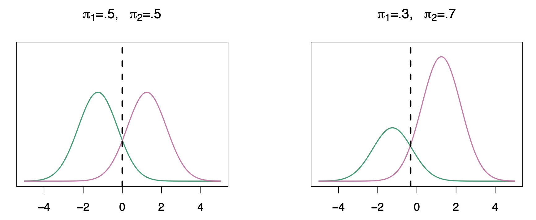 \[ \log \left( \frac{\Pr(Y = k \mid X = x)}{\Pr(Y = K \mid X = x)} \right) = \log \left( \frac{\pi_k f_k(x)}{\pi_K f_K(x)} \right) \]