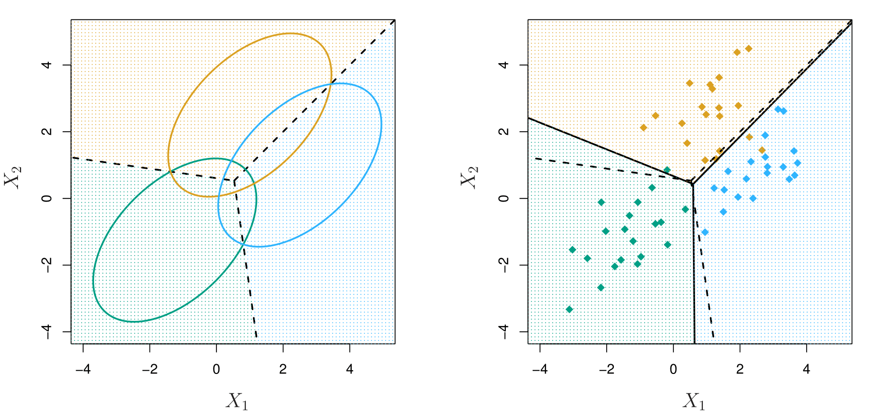 Posterior Probabilities: The posterior probability combines the prior (\(\pi_k\)) and the likelihood (\(\hat{f}_k(x^*)\)).