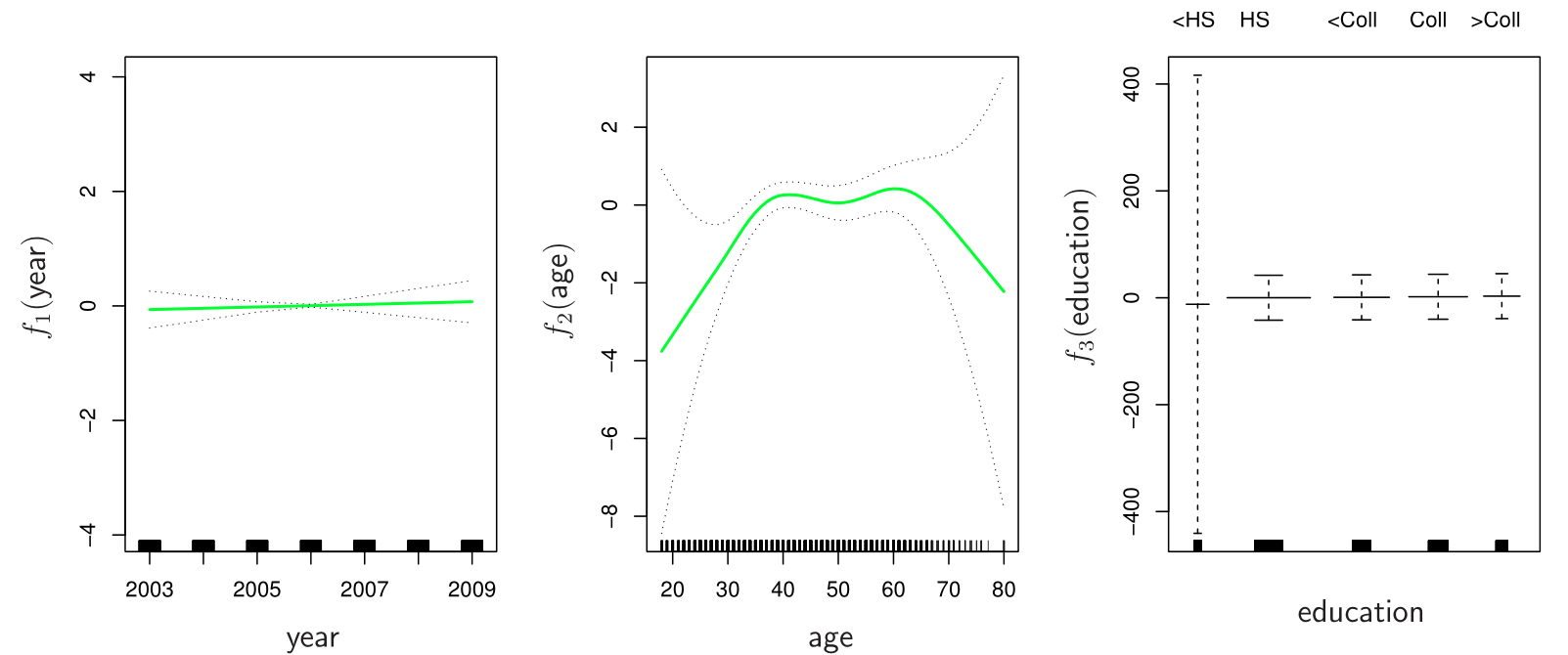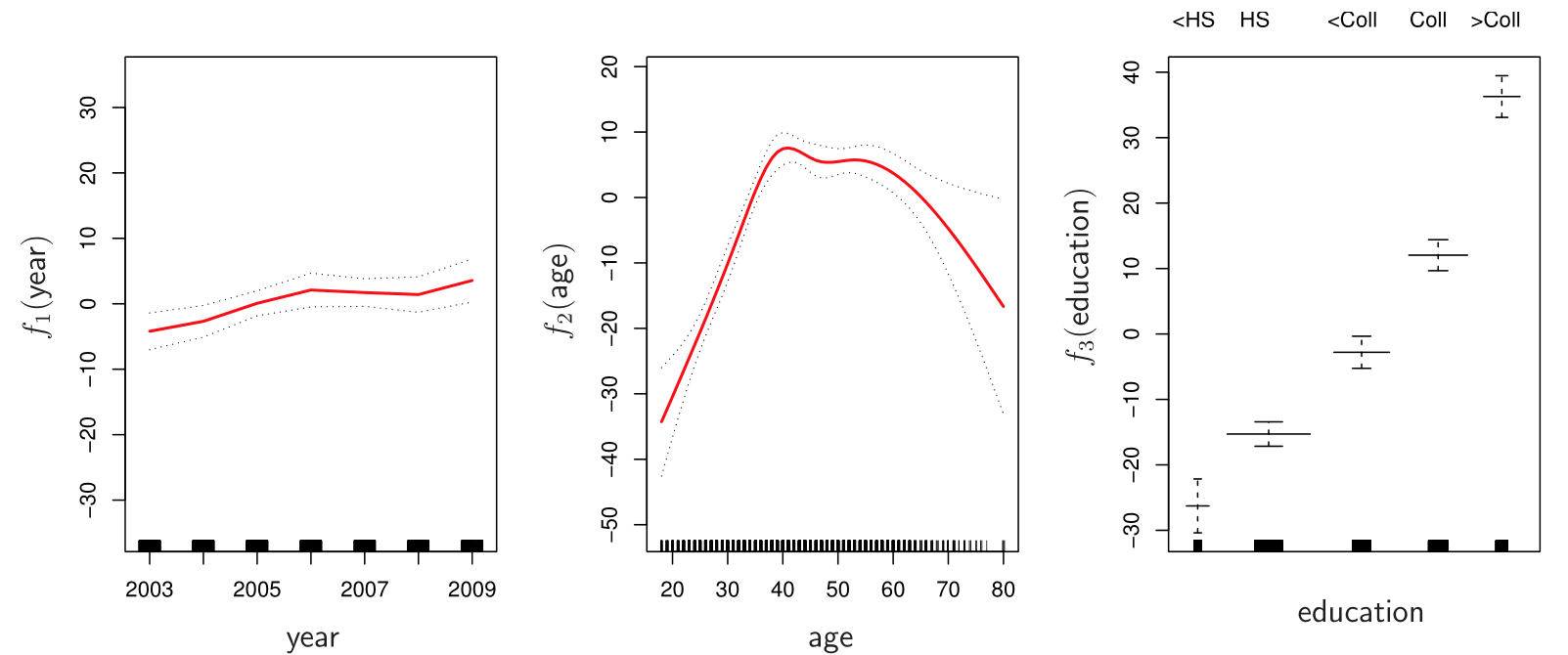\[ y_i = \beta_0 + f_1(x_{i1}) + f_2(x_{i2}) + \cdots + f_p(x_{ip}) + \epsilon_i. \]