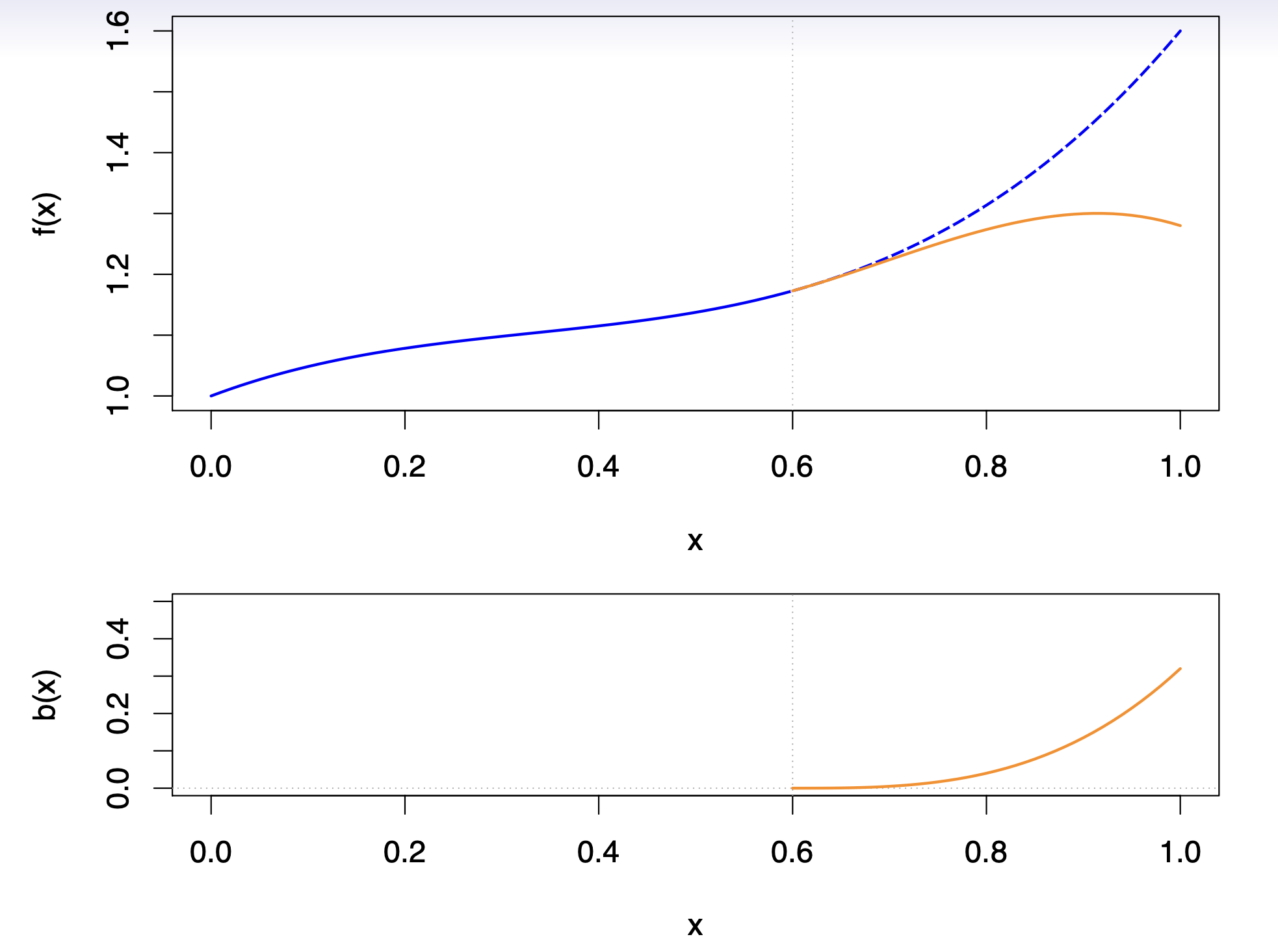 Top plot: shows two linear fits over the domain \(0 \le x \le 1\). The blue line represents a single global linear function (extending as the dashed line beyond the knot at \(x = 0.6\)), whereas the orange line demonstrates how adding a spline basis function allows the slope to change precisely at \(x = 0.6\).
