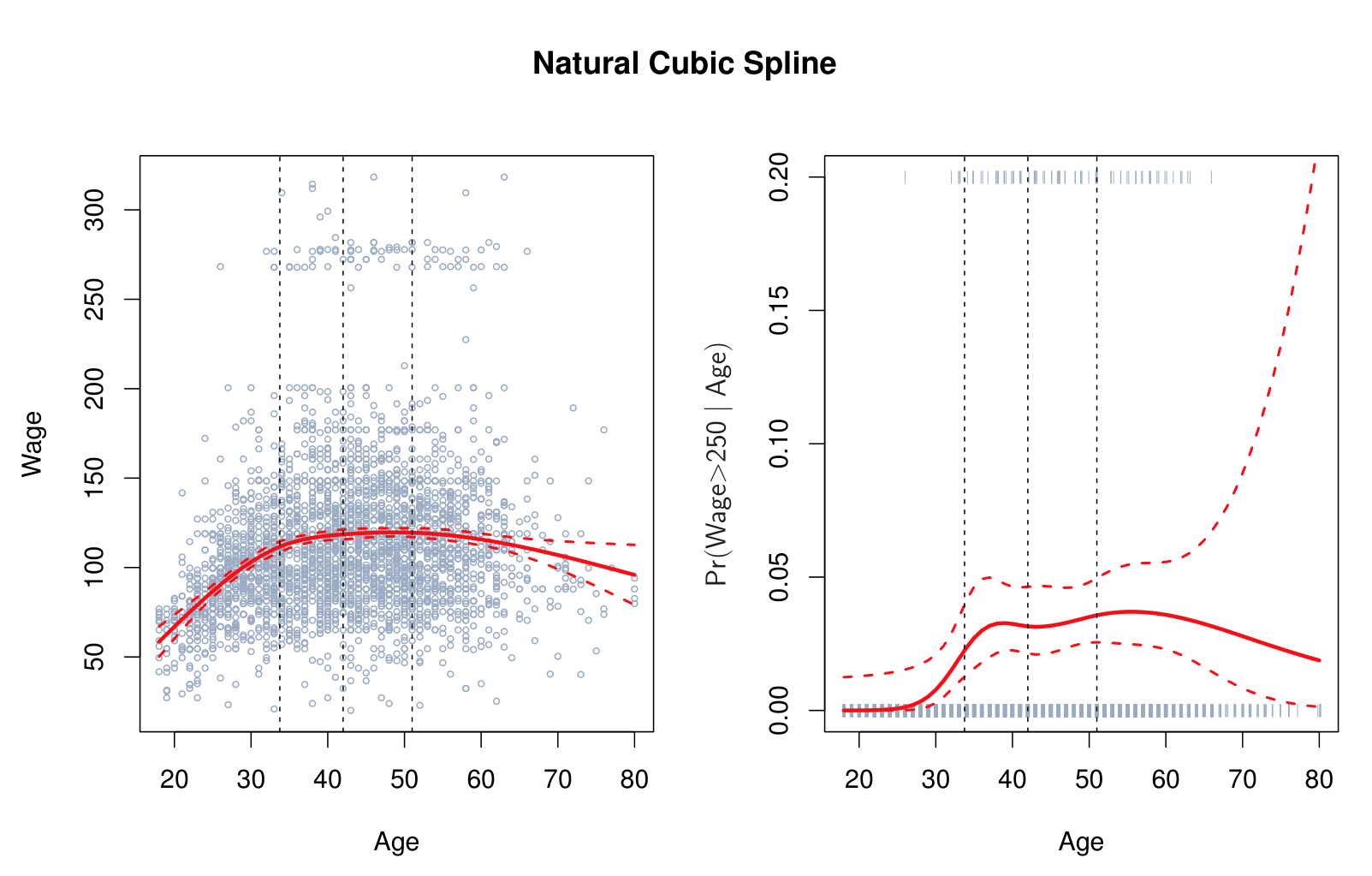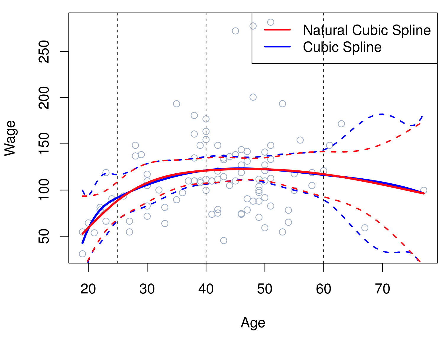 A natural cubic spline extrapolates linearly beyond the boundary knots. This adds \(4 = 2 \times 2\) extra constraints, and allows us to put more internal knots for the same degrees of freedom as a regular cubic spline.