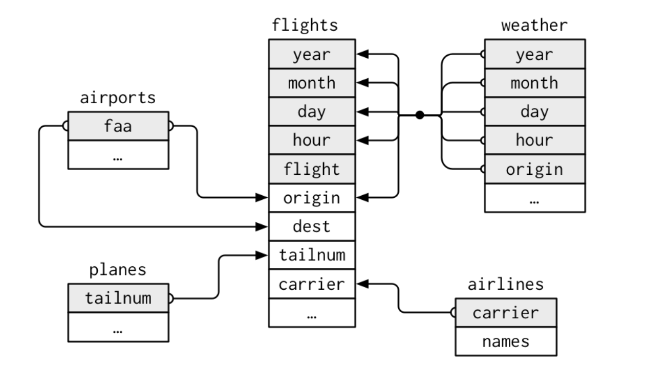 For this lecture, we will use the nycflights13 package, which comes with several related datasets about flights departing from NYC in 2013.