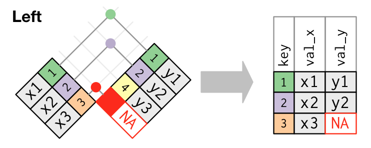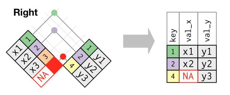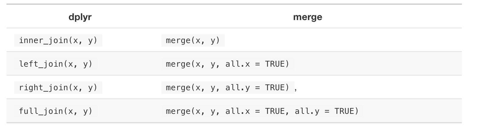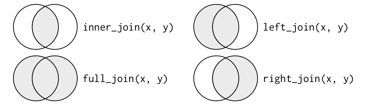 planes by: tailnum.airlines by: carrier.airports by: origin and dest.weather by: origin, year, month, day, hour.full_join()inner_join()right_join()left_join()For instance, to attach airline names to flights: