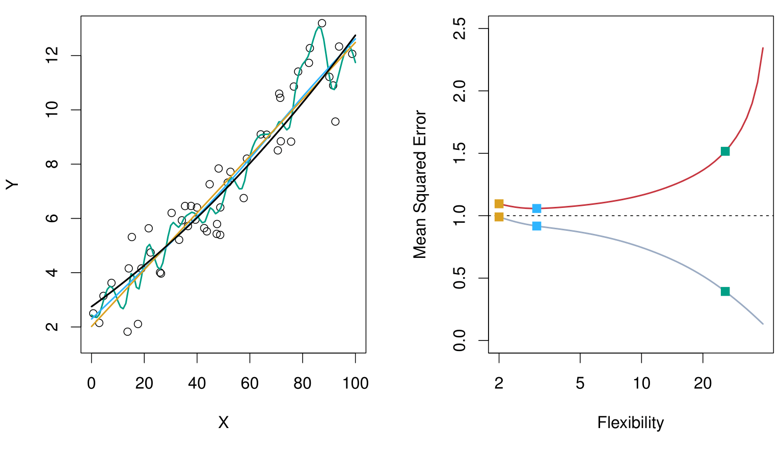 Typically, as the flexibility of \(\hat{f}\) increases, its variance increases and its bias decreases. Hence, choosing the flexibility based on average test error amounts to a bias-variance trade-off.