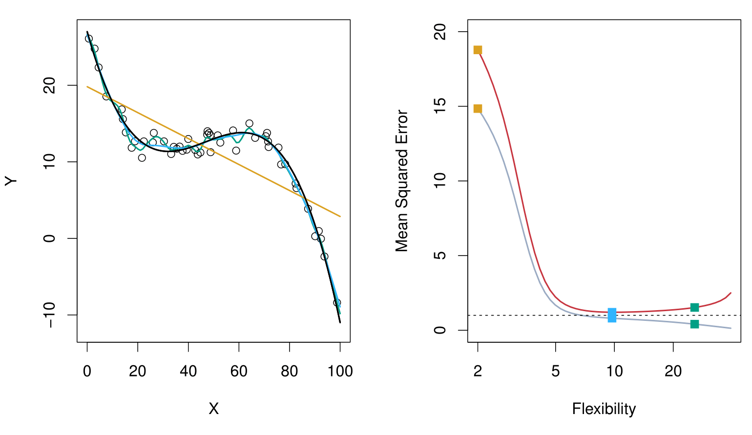 Below is a schematic illustration of the mean squared error (MSE), bias, and variance curves as a function of the model’s flexibility.