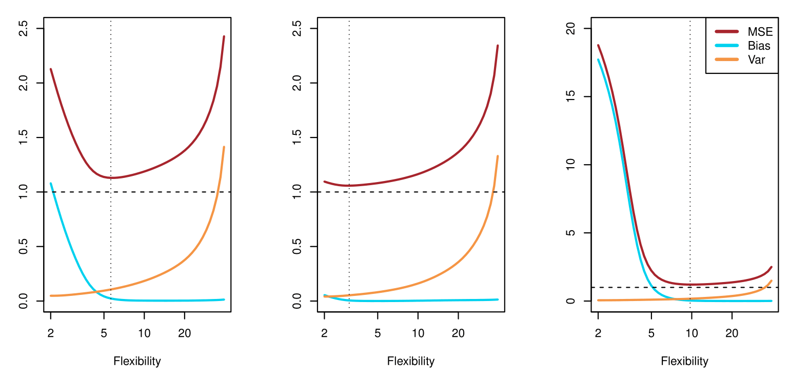 The vertical dotted line in each panel suggests a model flexibility that balances both bias and variance in an “optimal” region for minimizing MSE.