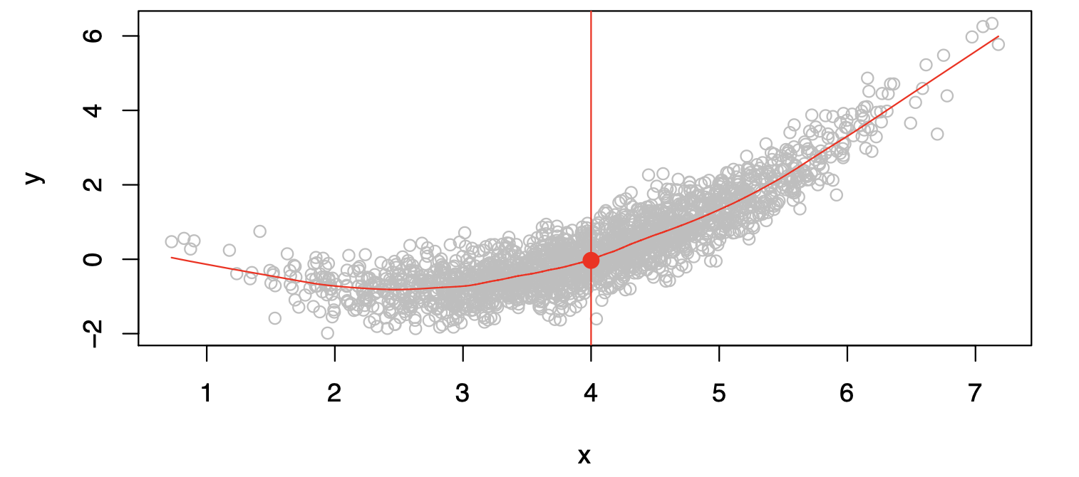 Often, we lack sufficient data points for exact computation of \(E(Y|X=x)\).