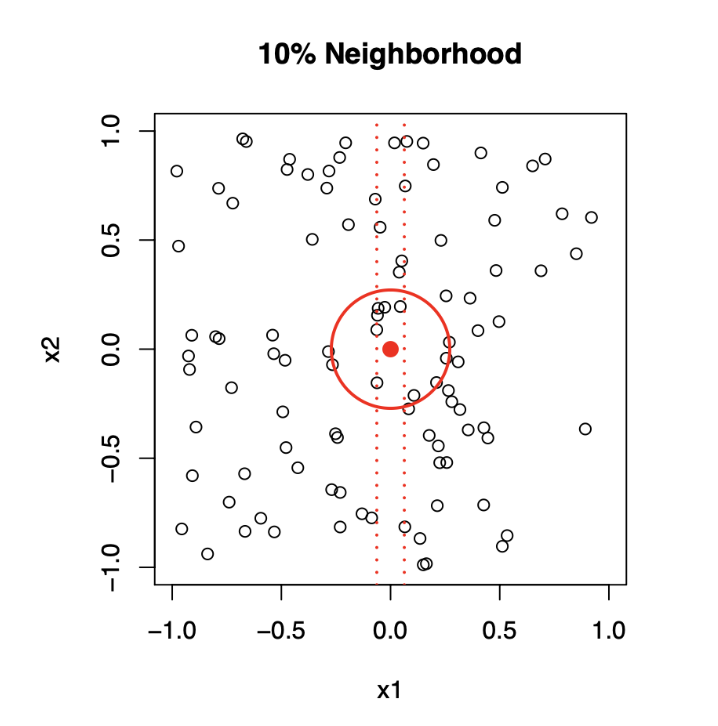 A 10% neighborhood in high dimensions is no longer truly local, so we lose the spirit of estimating \(\mathbb{E}[Y \mid X = x]\) via local averaging.
