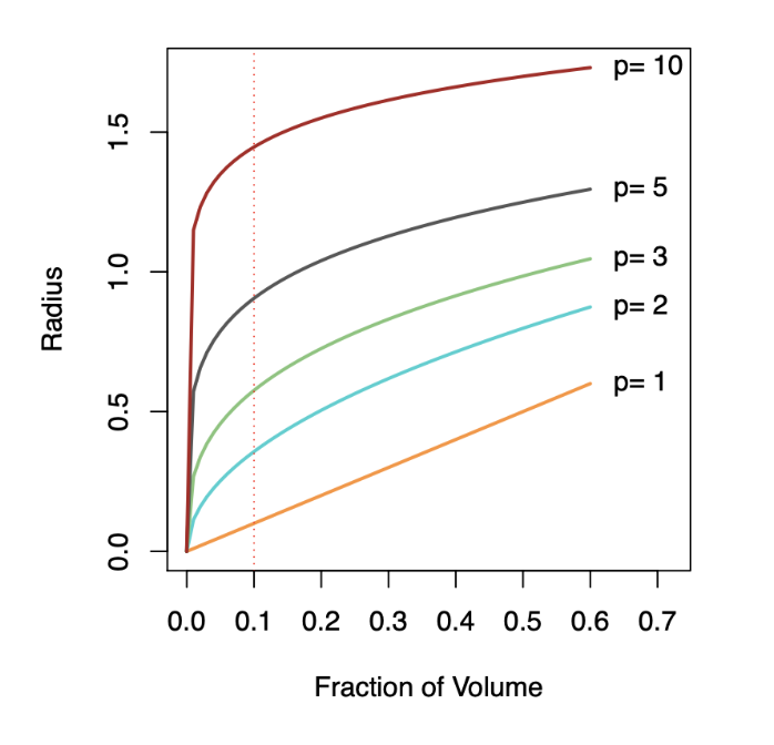 Key Takeaway: As dimensionality increases, neighborhoods must expand significantly to capture the same fraction of data points, illustrating the curse of dimensionality.