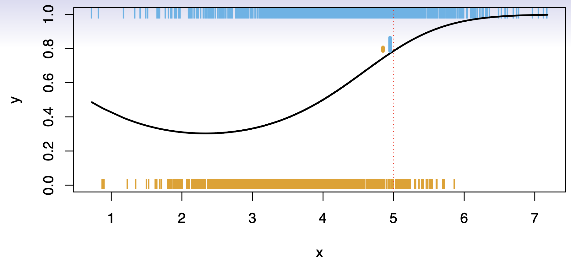 These are the conditional class probabilities at \(x\); e.g. see little barplot at \(x=5\).