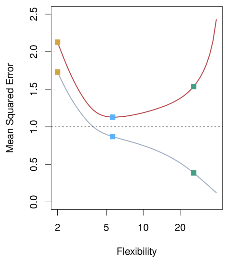 Red Curve: Test data MSE across models of increasing flexibility.