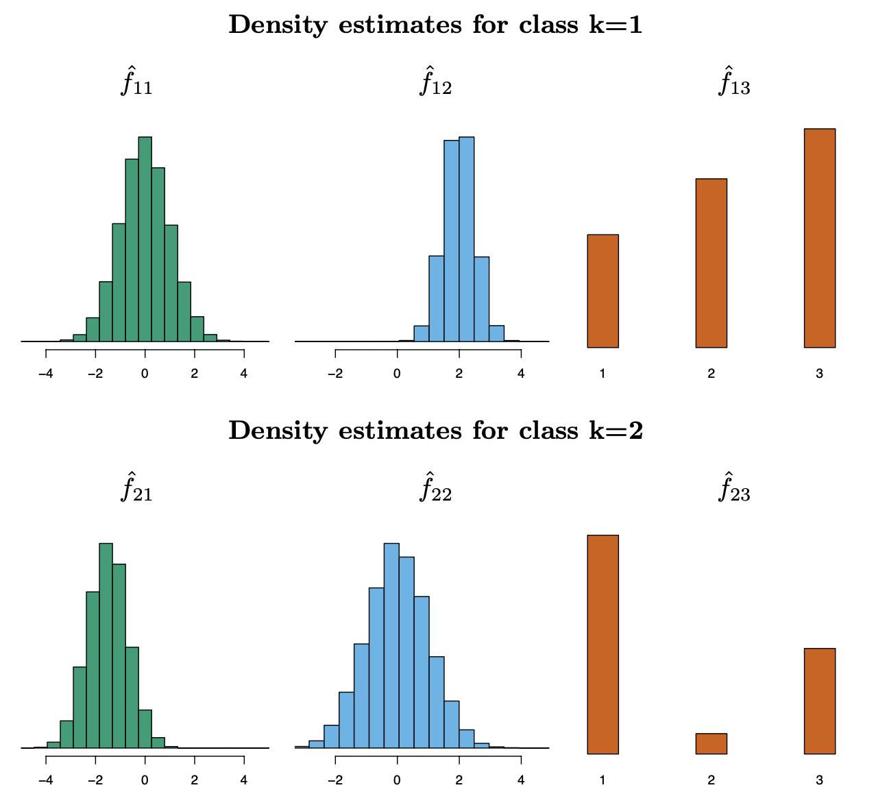 \[ \Pr(Y = k | X = x) = \frac{\pi_k \times f_{k1}(x_1) \times f_{k2}(x_2) \times \cdots \times f_{kp}(x_p)}{\sum_{l=1}^{K} \pi_l \times f_{l1}(x_1) \times f_{l2}(x_2) \times \cdots \times f_{lp}(x_p)} \]