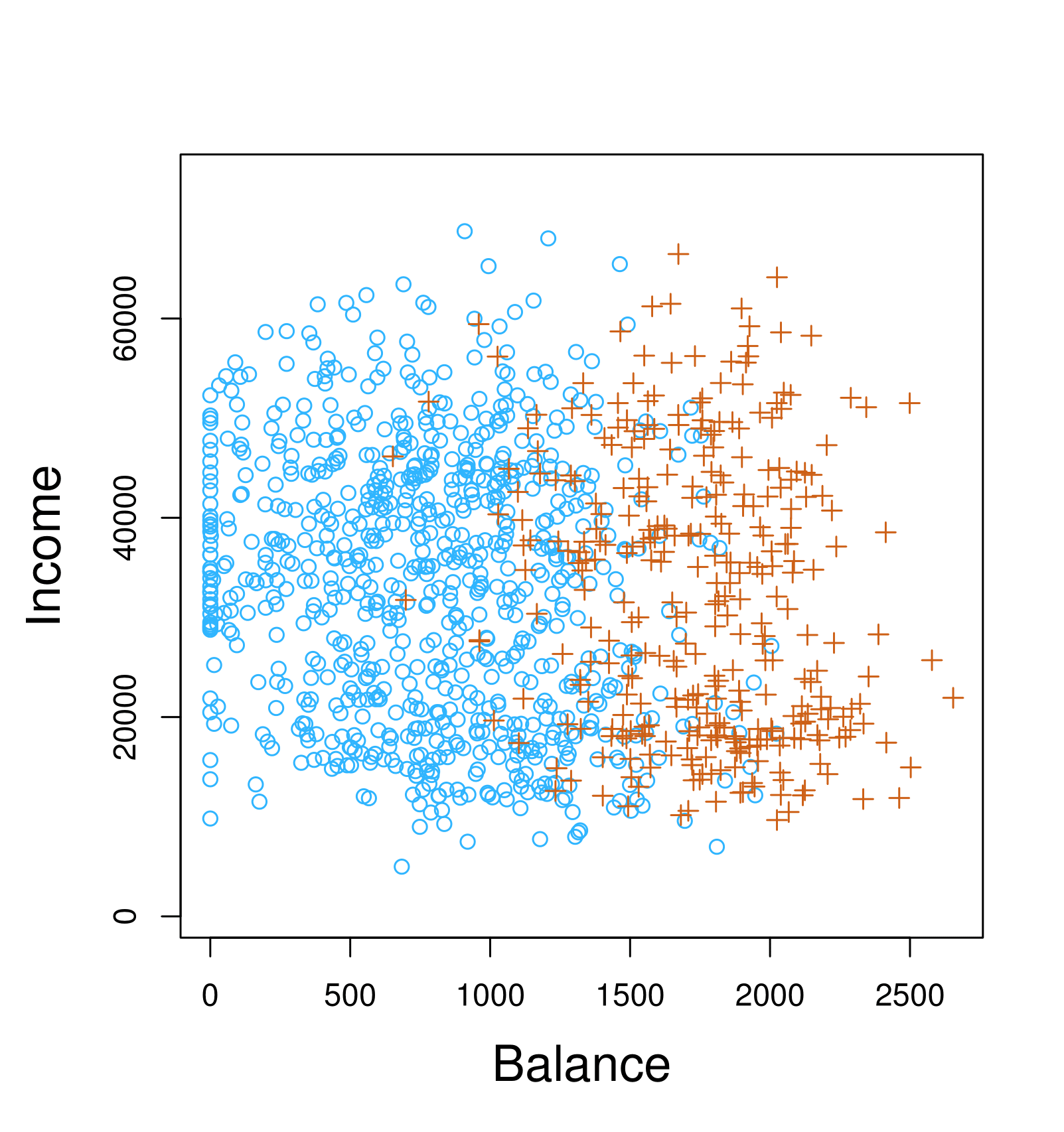 Scatter plot of income vs. balance with markers indicating whether a person defaulted (e.g., “+” for defaulted, “o” for not defaulted).