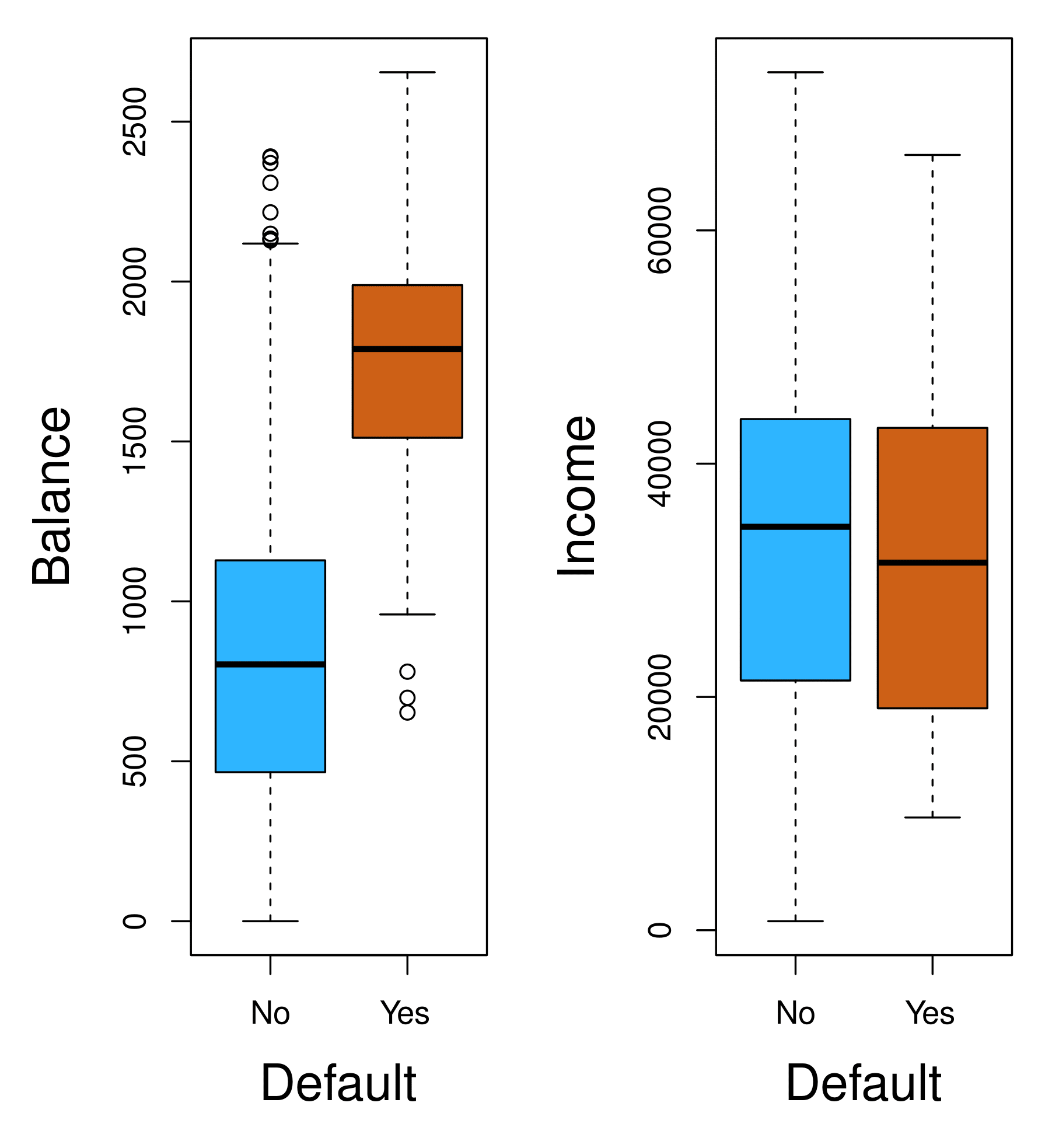 Boxplots comparing balance and income for default (“Yes”) vs. no default (“No”).