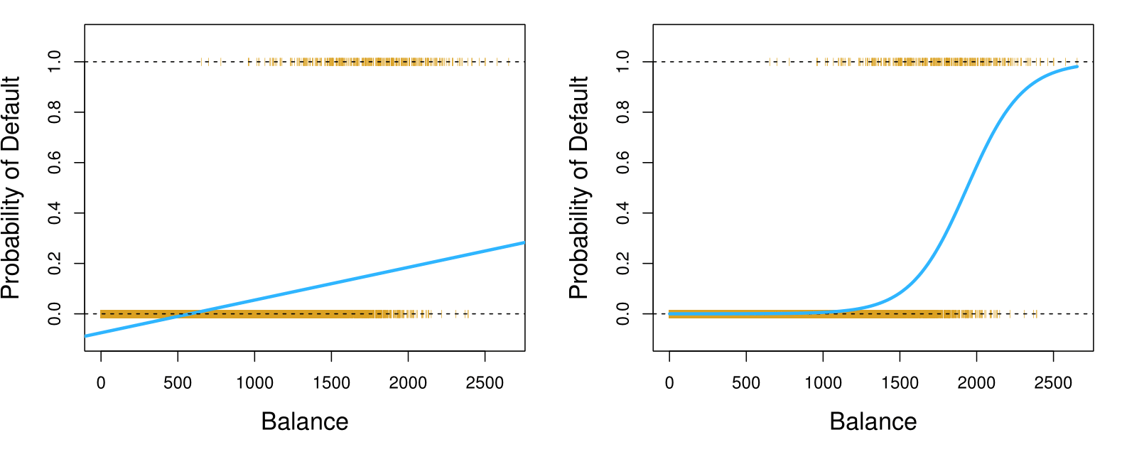 Let’s write \(p(X) = \Pr(Y = 1|X)\) for short and consider using balance to predict default. Logistic regression uses the form: