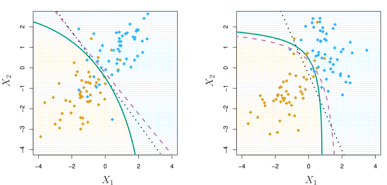 \[ \Pr(Y = k \mid X = x^*) = \frac{\hat{\pi}_k \hat{f}_k(x^*)}{\sum_{k=1}^2 \hat{\pi}_k \hat{f}_k(x^*)} \]
