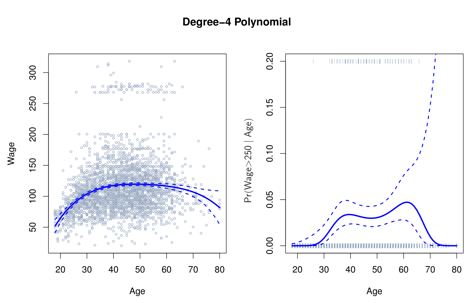 \[ \text{Pr}(y_i > 250 \mid x_i) = \frac{\exp(\beta_0 + \beta_1 x_i + \beta_2 x_i^2 + \dots + \beta_d x_i^d)}{1 + \exp(\beta_0 + \beta_1 x_i + \beta_2 x_i^2 + \dots + \beta_d x_i^d)}. \]