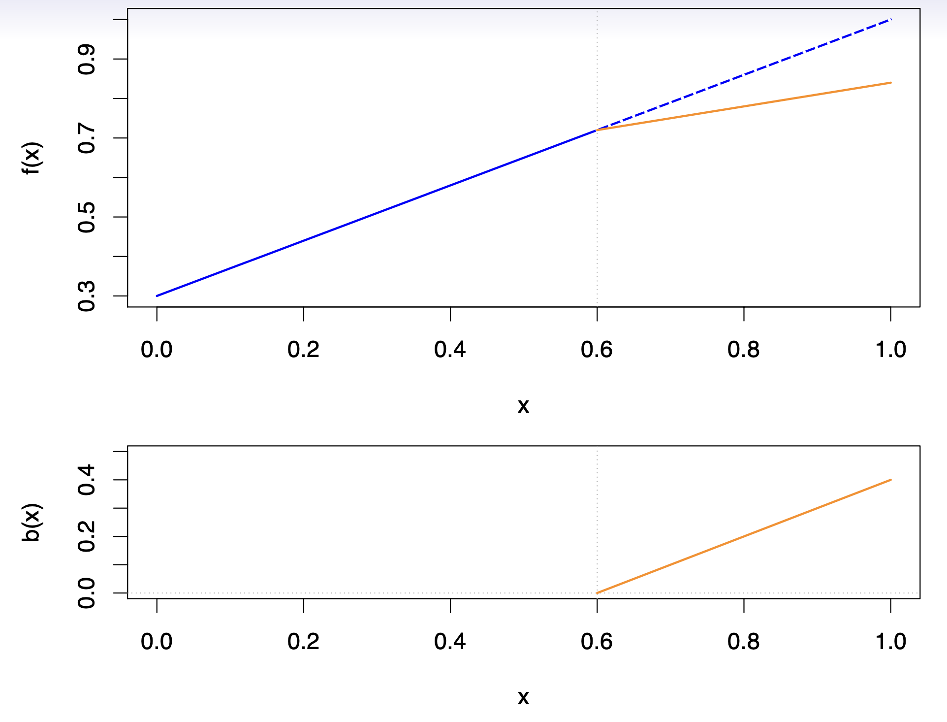 Top plot: shows two linear fits over the domain \(0 \le x \le 1\). The blue line represents a single global linear function (extending as the dashed line beyond the knot at \(x = 0.6\)), whereas the orange line demonstrates how adding a spline basis function allows the slope to change precisely at \(x = 0.6\).