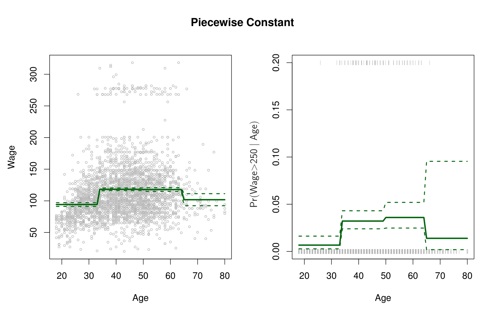 A step function model partitions the range of a predictor variable \(X\) into multiple intervals and creates a set of dummy (0/1) indicators—one for each interval. By fitting a standard linear model with these dummy variables, the resulting function is piecewise constant: within each interval, the fitted value remains the same.