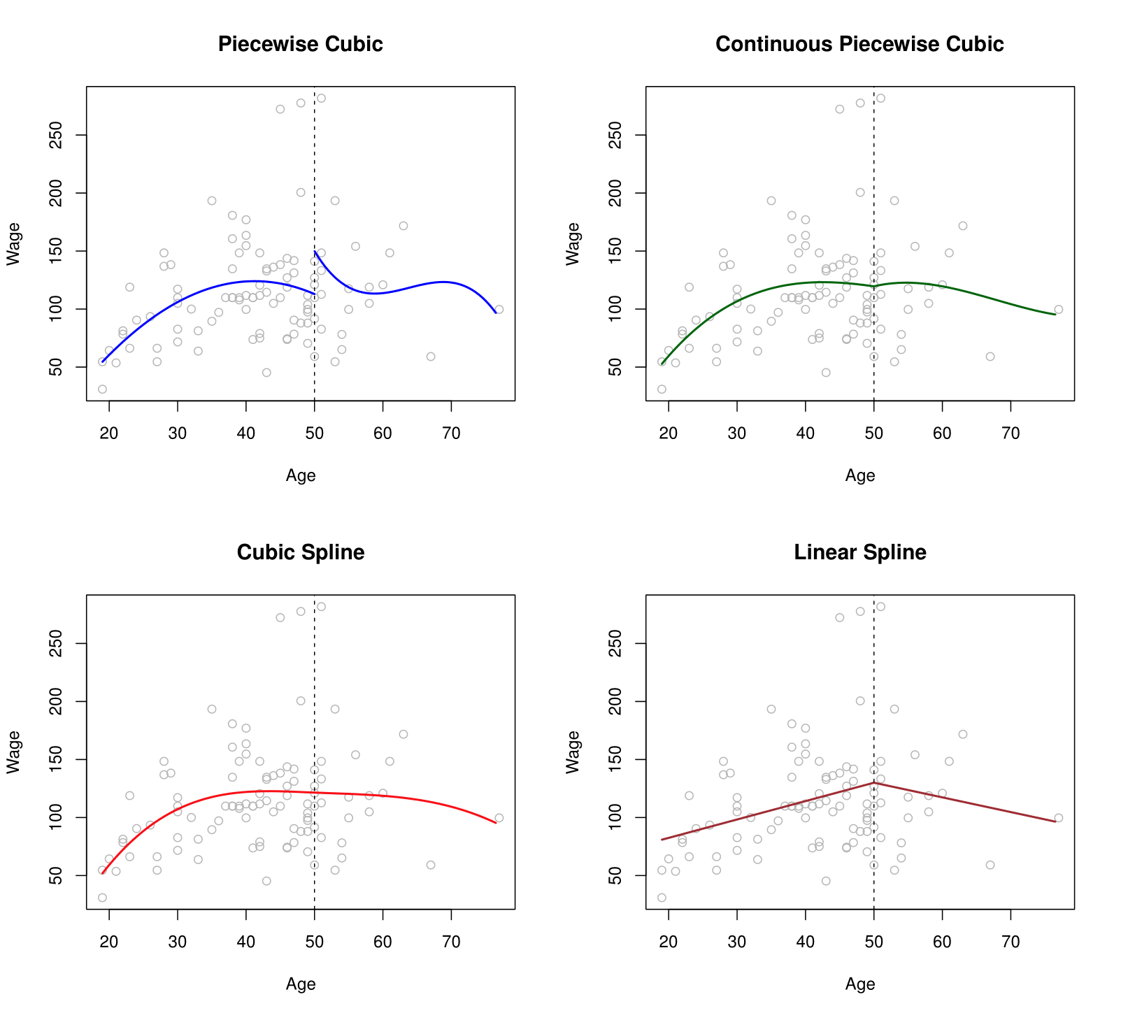 Top-Left Panel: A third-degree polynomial is fitted to the data on the left side of the knot at \(X = 50\), and another (separate) third-degree polynomial is fitted on the right side. There is no continuity constraint imposed at the knot, meaning the two polynomials may not meet at the same function value at \(X = 50\).
