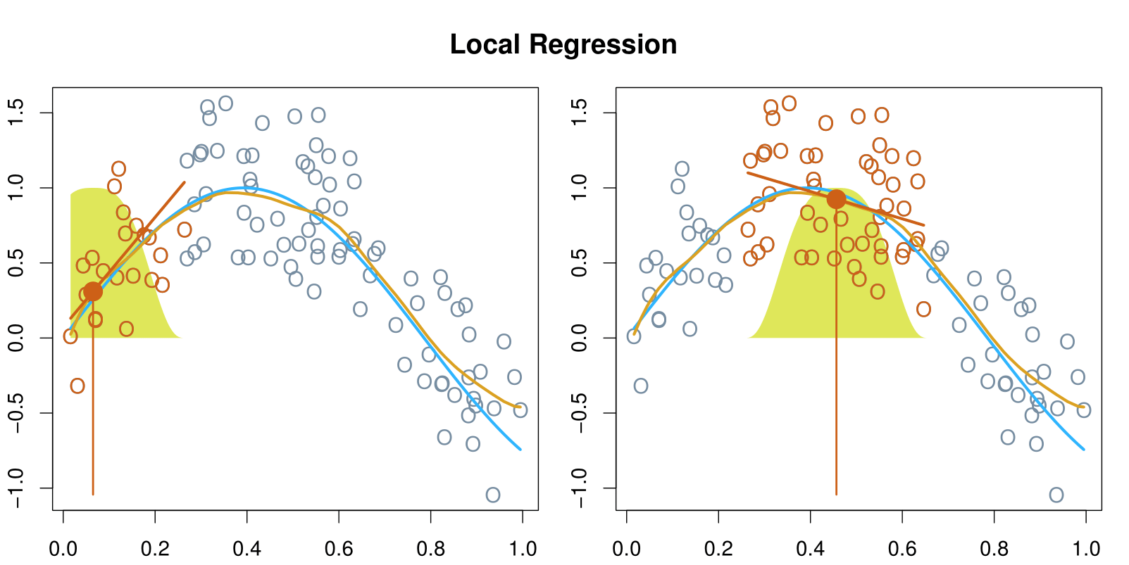 Local regression is similar to splines, but differs in an important way. The regions are allowed to overlap, and indeed they do so in a very smooth way.