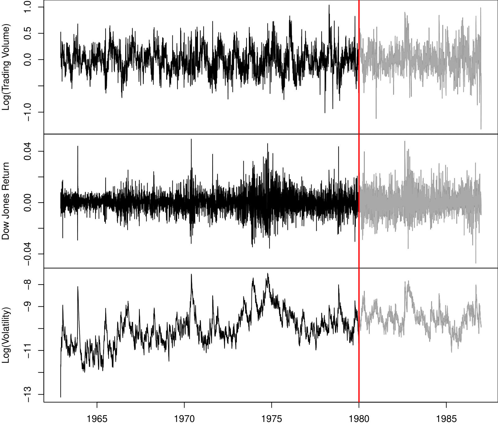 Three daily time series for the period December 3, 1962, to December 31, 1986 (6,051 trading days):